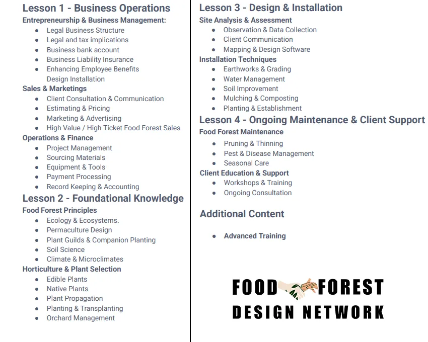 It’s time to break free from small, low-value jobs and start building a business that sets you apart. With the Food Forest Design Network, you’ll gain access to the tools, leads, and community you need to scale your income and impact.